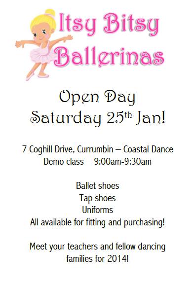Our friends at Itsy Bitsy Ballerinas will be having an open day at the studio this Saturday the 25th January from 9:00 – 10:30. There will be a 30 minute demo class open to new & returning students with uniforms & shoes available to purchase after class. For more information visit www.itsybitsyballerinas.com