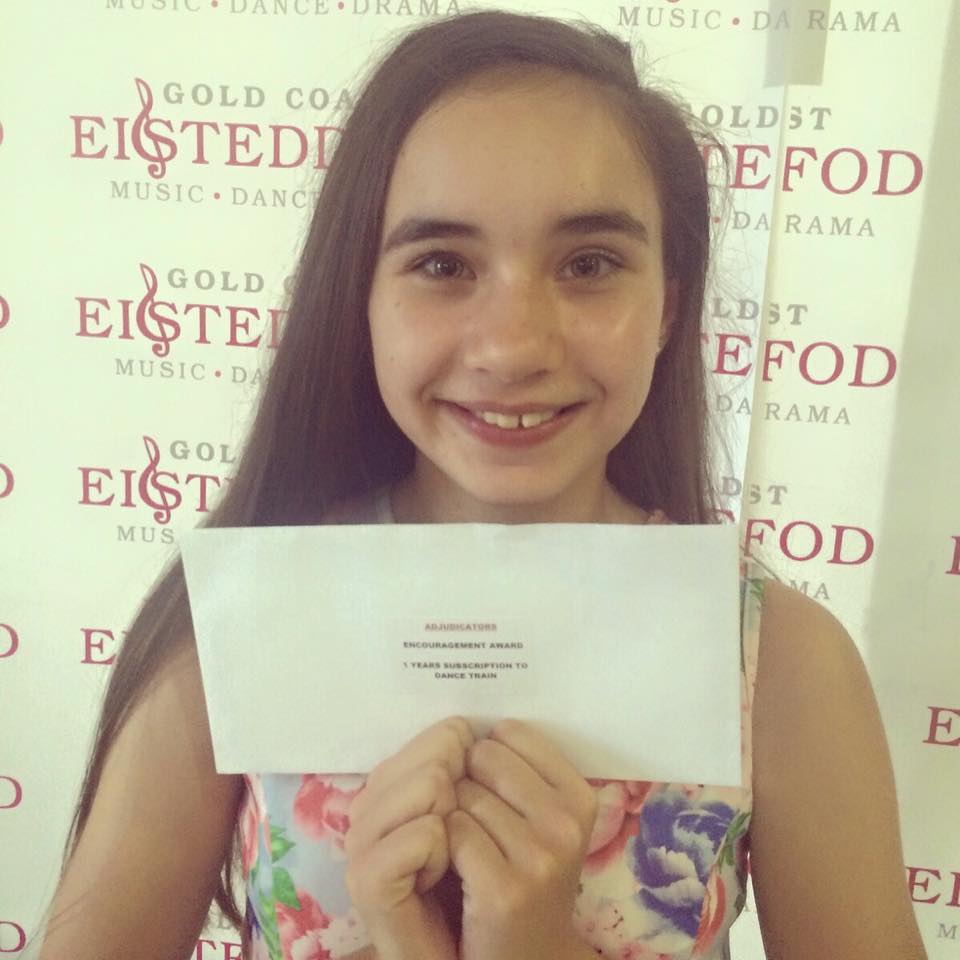 Congratulations to Amelia Mills who was awarded an adjudicators encouragement award at the Gold Coast Eisteddfod! Amelia received a years subscription to DanceTrain magazine.