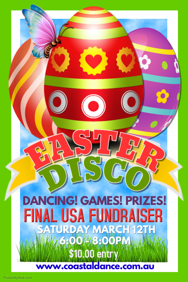 Coastal Dance will be holding our first disco of the year on Saturday the 12th of March from 6:00 – 8:00pm to celebrate Easter! All students & their friends are invited to attend with all funds raised going towards our seniors upcoming USA trip. Entry is $10 & Coastal Dance students are asked to bring a plate of food to share. Our discos are lots of fun & it’s a great chance for our new & old students to mix outside of dancing!