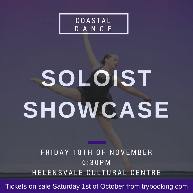 Coastal Dance will be holding our 4th Soloist Showcase on Friday the 18th of November at the Helensvale Cultural Centre. The showcase will start at 6:30pm & it is open to the general public. Tickets are $10 & they go on sale on Saturday the 1st of October at trybooking.com. This is a great nightContinue reading “Soloist Showcase”